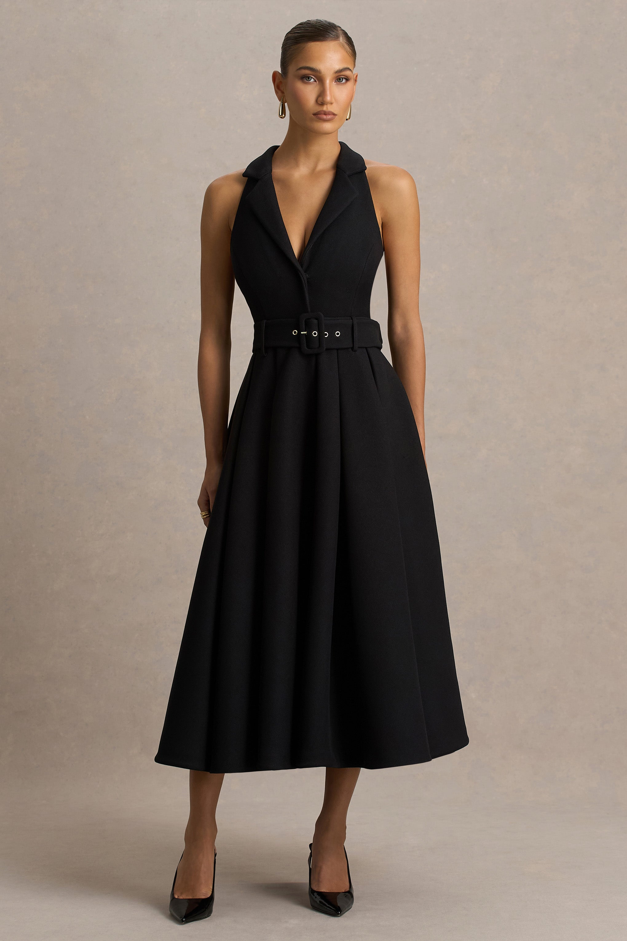 Alessa | Black Plunge-Neck Tailored Midi Dress