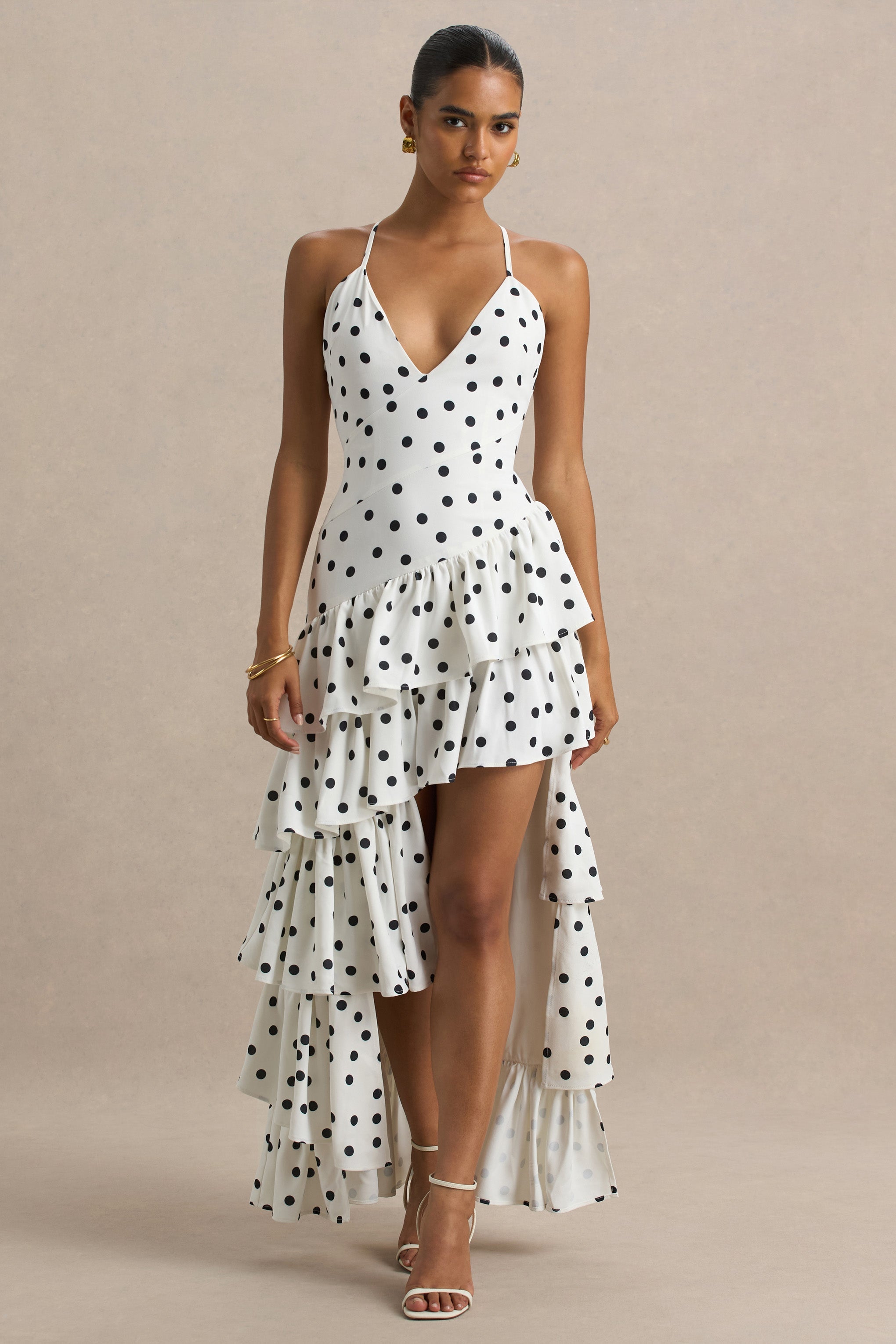 Turn heads from every angle in Bogota. a bold and playful take on timeless glamour. Cut from our premium polka dot crepe. this standout style features a plunging neckline and drop waist that flatters the silhouette while adding a touch of drama. Delicate crossover straps frame a deep V-shaped back. while a cascading layered-ruffled skirt moves effortlessly with every step. For moments that call for feminine elegance. Bogota is the perfect choice with strappy heels and dainty jewellery.