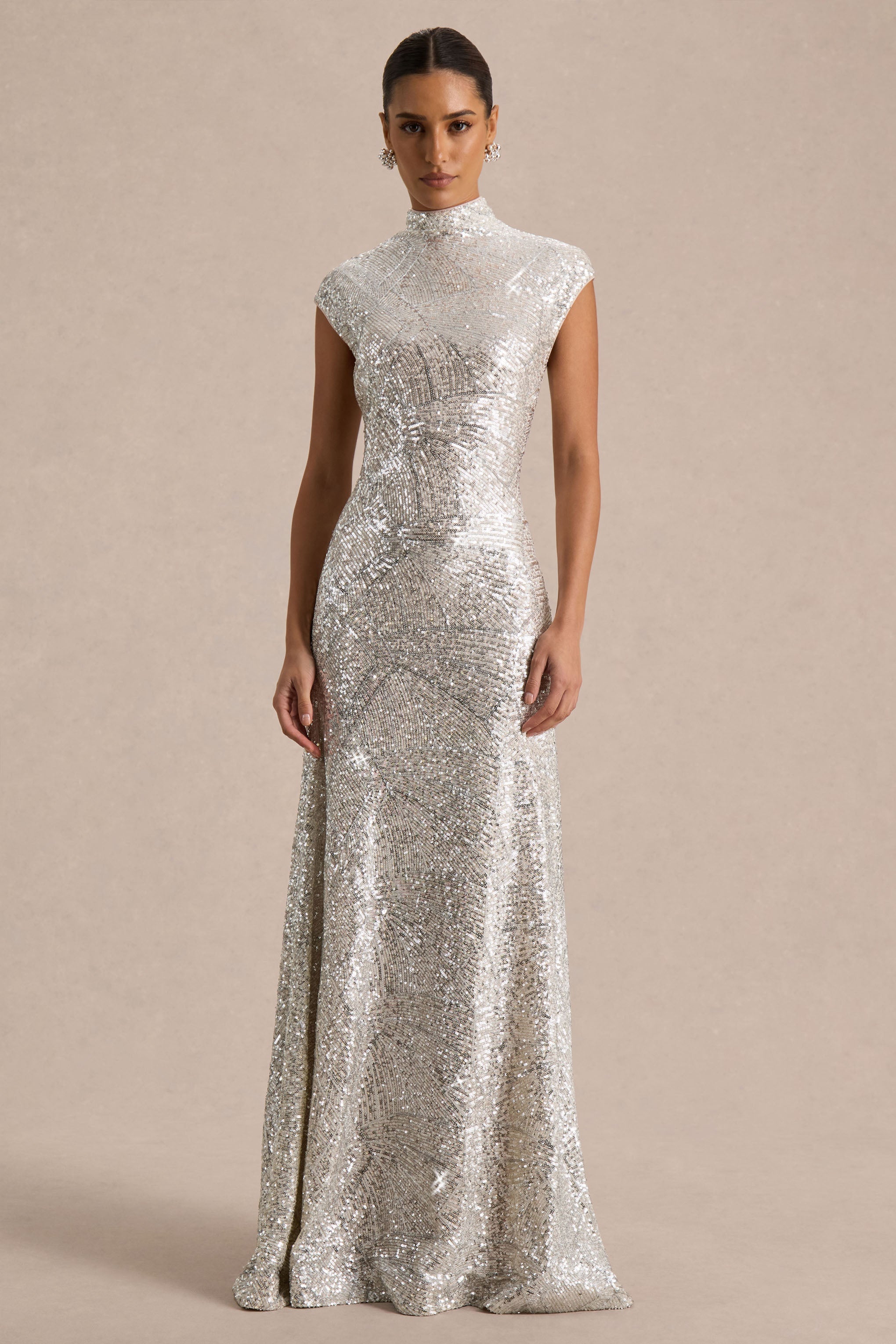 Cecy | Silver Sequin High-Neck Maxi Dress With Cap Sleeves