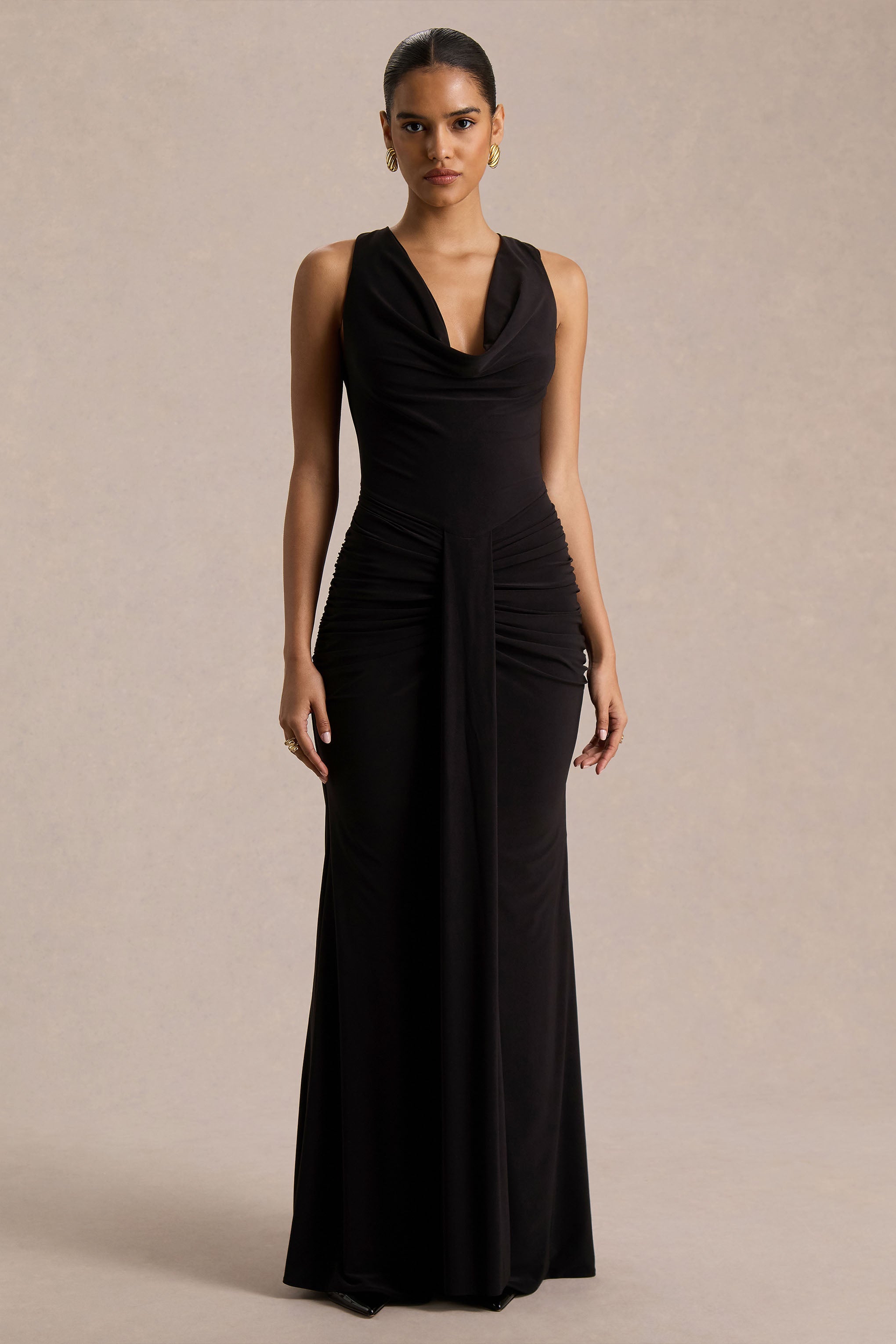 Mallie | Black Cowl-Neck Maxi Dress With Gathered-Detailing