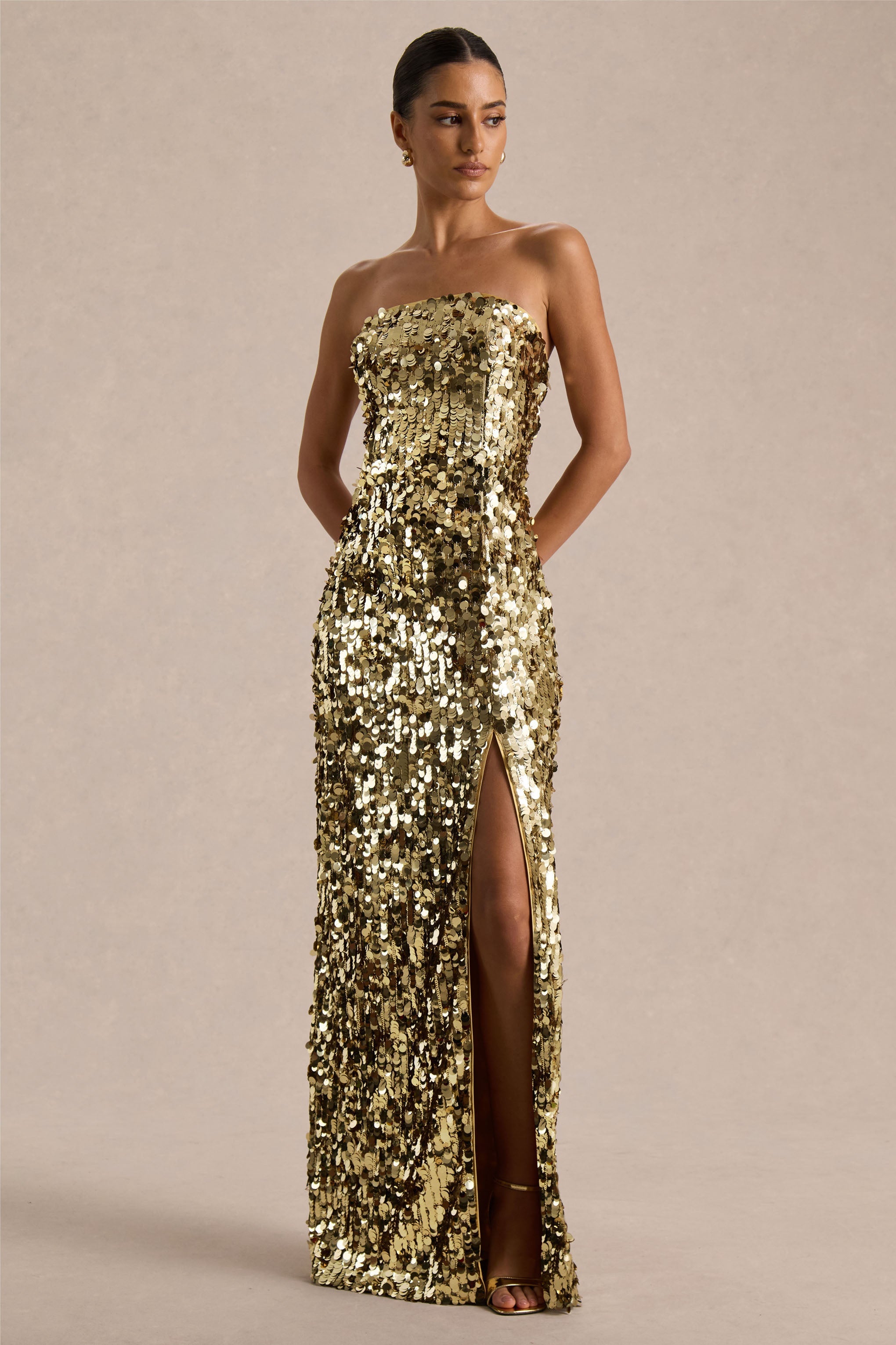 Nerea | Gold Sequin Bandeau Maxi Dress With Front High-Split