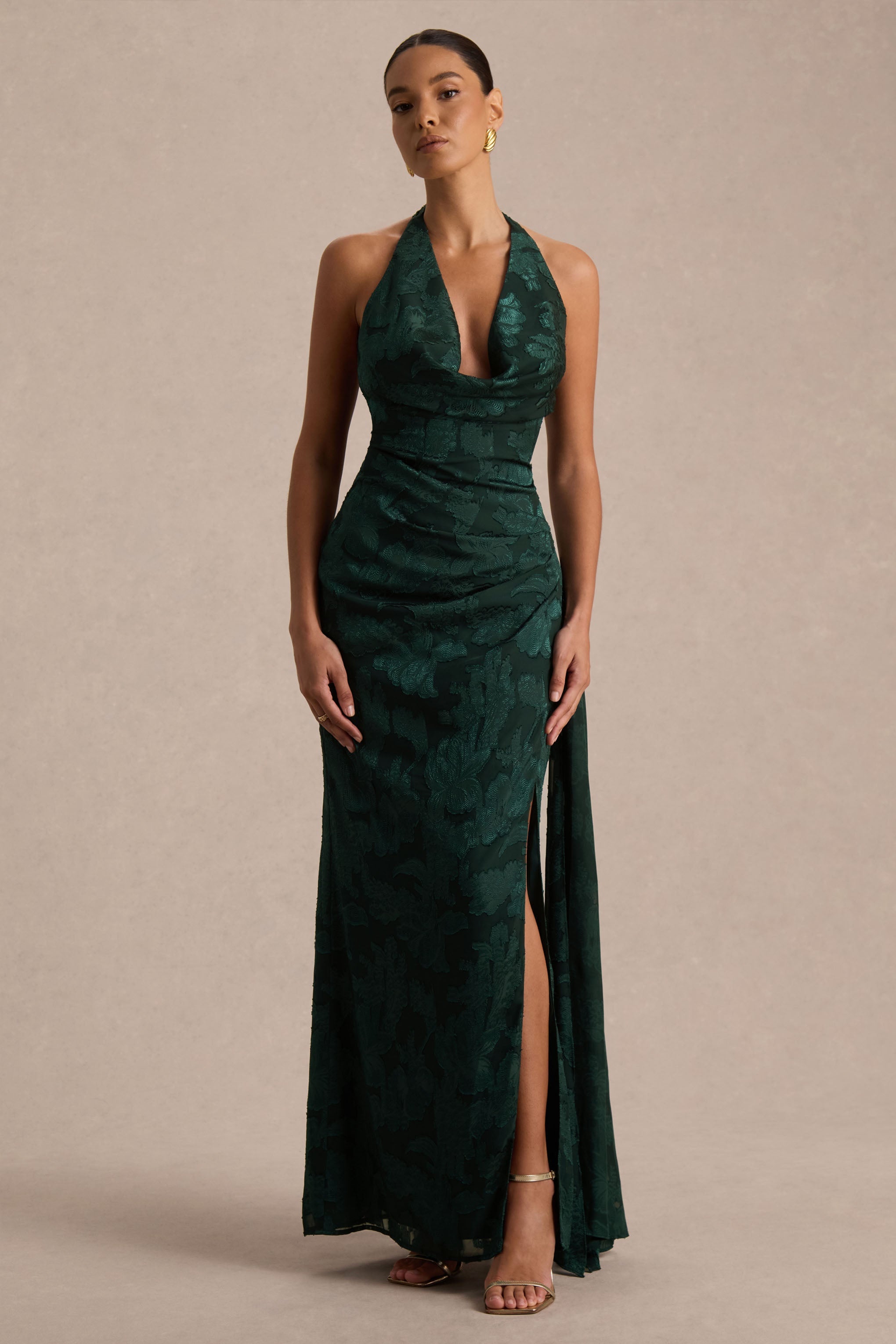 Command attention in Talula. a show-stopping design made for unforgettable evenings. Crafted from our premium devore in a deep dark green hue. this maxi-length silhouette drapes effortlessly. contouring the body in all the right places. The daring cowl neckline is balanced with a self-tie halter detail for an elegant. adjustable finish. while the sash accent cinches the waist beautifully. A thigh-high front split adds a bold. sultry edge. Talula is the epitome of modern glamour.