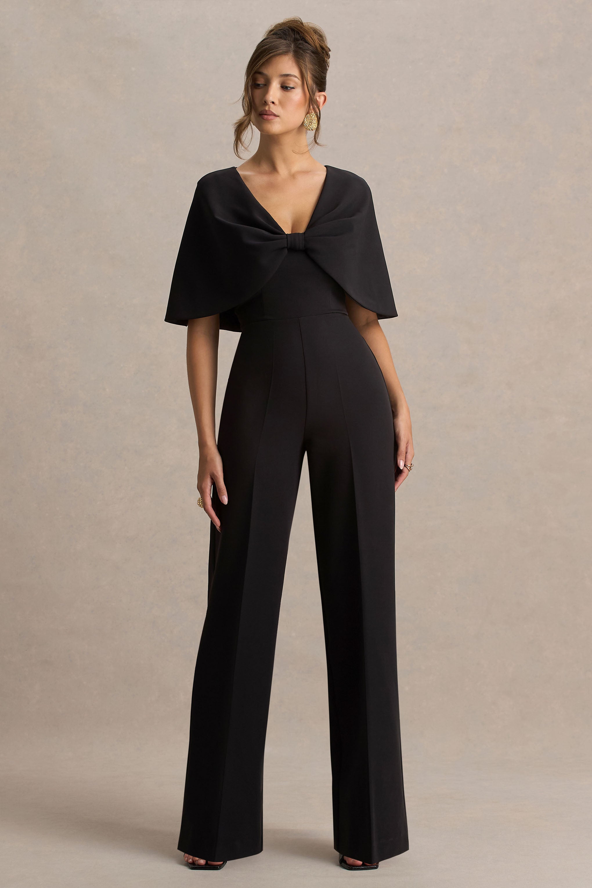 Sleek. striking. and made to command attention. Vivid is a statement piece with undeniable allure. Crafted from our premium black crepe. this jumpsuit balances elegance with drama for a truly unforgettable look. A daring plunge neckline is paired with a structured short cape. while the bow-knot detail creates a delicate and feminine silhouette. A contemporary classic for evenings where sophistication meets bold glamour. Style with sleek heels for a head-turning look.