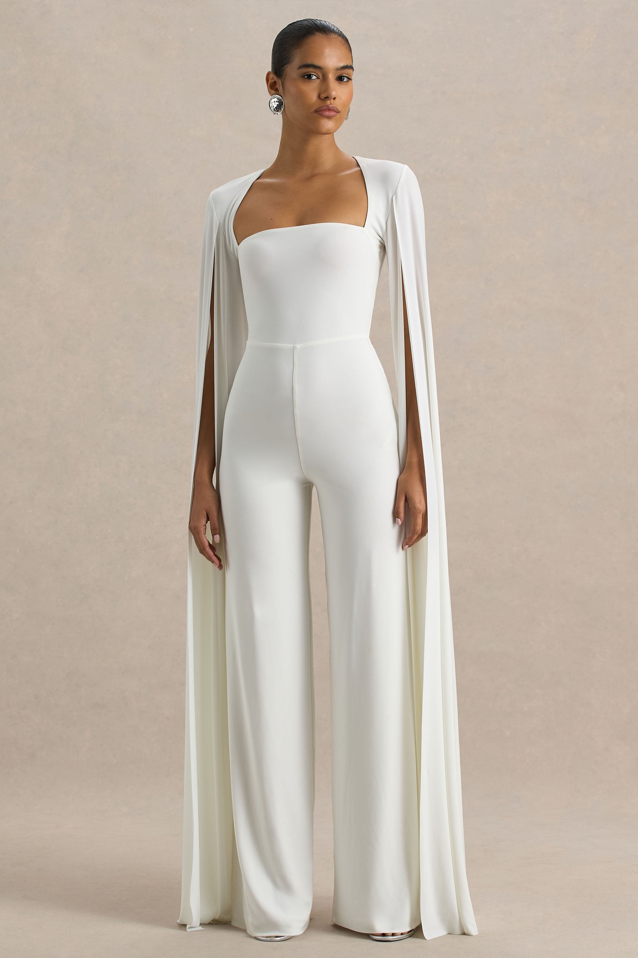 Command the rooms attention in our latest head turner. Zara. Curated from our premium scuba crepe. in a bold white hue. this jumpsuit will sculpt your curves gorgeously ensuring you feel as good as you look. Featuring a chic square neckline and dramatic cape sleeves. this piece exudes glamour and elegance at any upscale occasion. Style with sleek heels for a look that'll have all eyes on you.